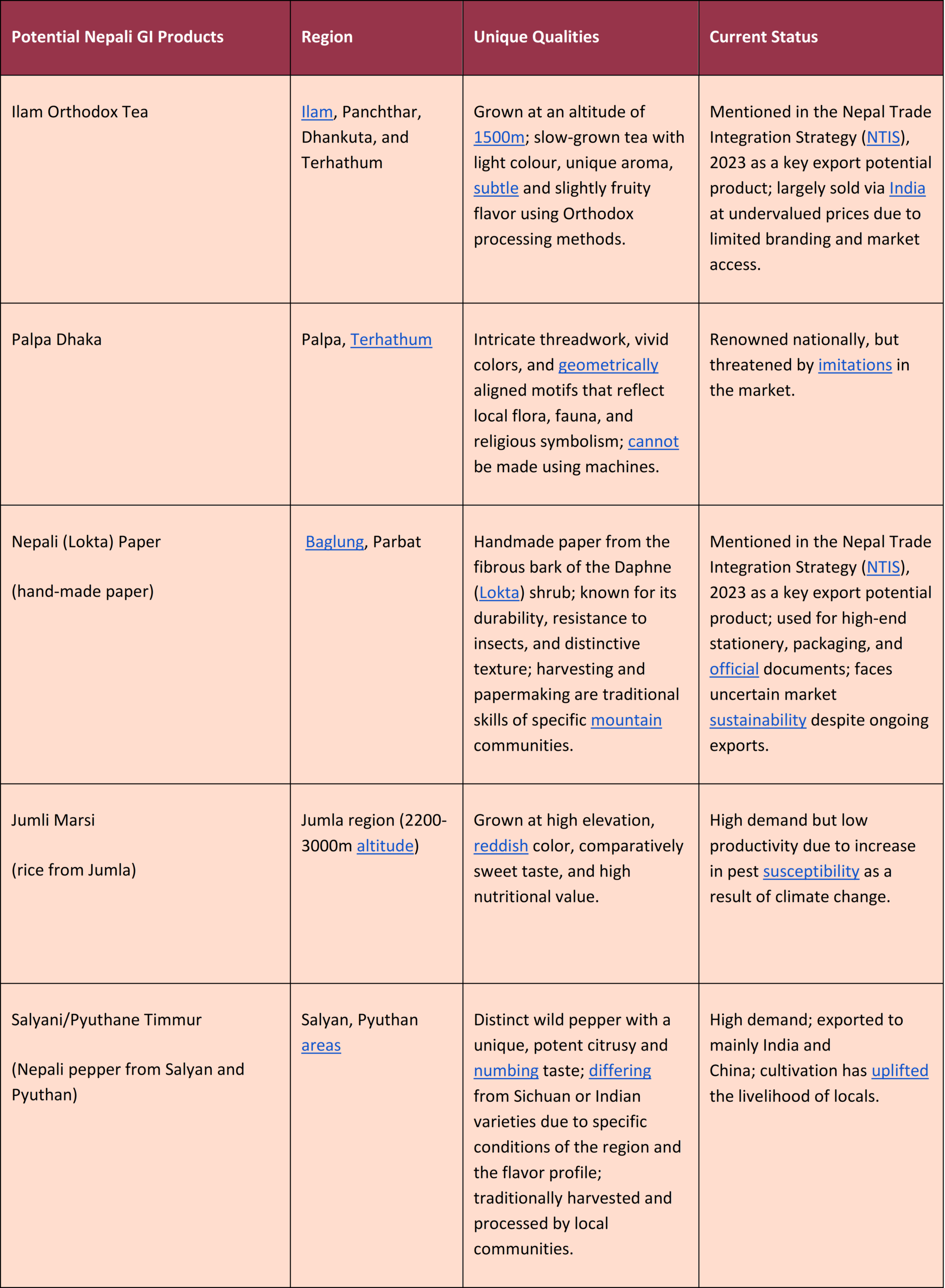 Nepal is a nation blessed with highly diversified climatic conditions which gives rise to a variety of agricultural products. On top of that, it consists of a rich culture, craftsmanship, and artisanal talent, giving rise to unique products such as textile. For Nepal, embracing GI is a strategic opportunity to pivot from selling such authentic yet unbranded commodities to marketing premium experiences. It aligns directly with the nation’s identity of authenticity, craftsmanship, and natural purity. A functional GI system would be a force multiplier for tourism, for high-value agriculture, and for equitable rural development. GI has the immense potential to transform Nepali cultural heritage into a competitive economic advantage. Table 1 depicts some products from Nepal that have potential to get GI-tagged.