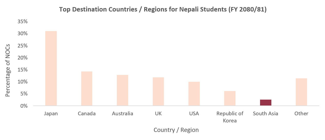 In FY 2023/24 AD (2081/82 BS), the Nepali Ministry of Education, Science and Technology issued 112,256 No Objection Certificates (NOCs), a document required for students to study abroad. Among these students, most went to Japan, Canada, Australia, the United Kingdom, the United States and South Korea. Only 2.54% of students went to South Asia, primarily to India and Bangladesh — though it should be noted that many Nepali students study in India without taking a NOC.