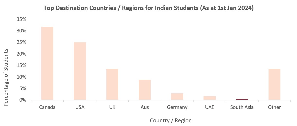 Similarly, most Indian students pursuing higher education abroad are in countries like Canada, the United States, the United Kingdom, Australia and Germany. Only 0.81% of Indian students are studying in South Asia.